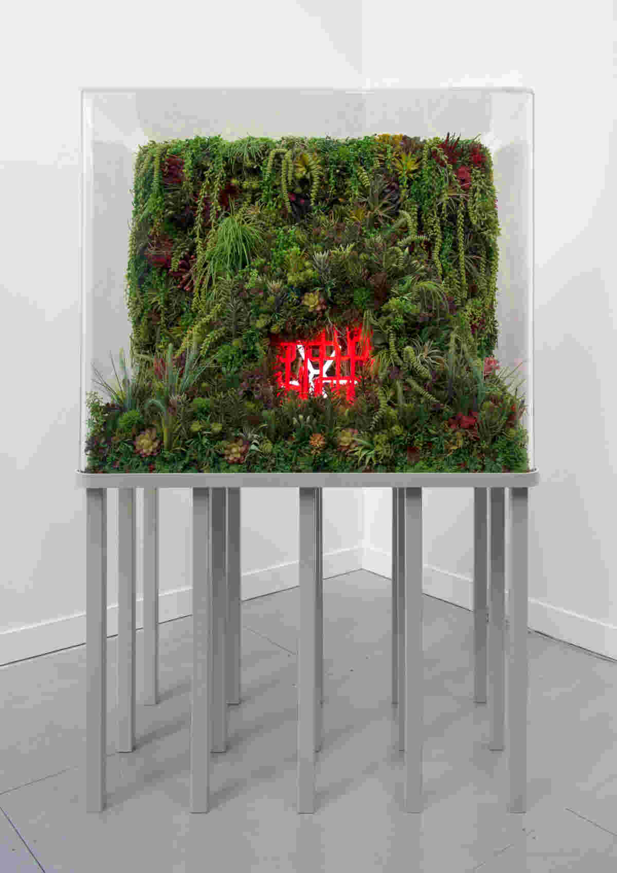 customized acrylic vitrine, neon lamps, modeled landscape, artificial plants and detritus, powder coated steel, aluminum, resin