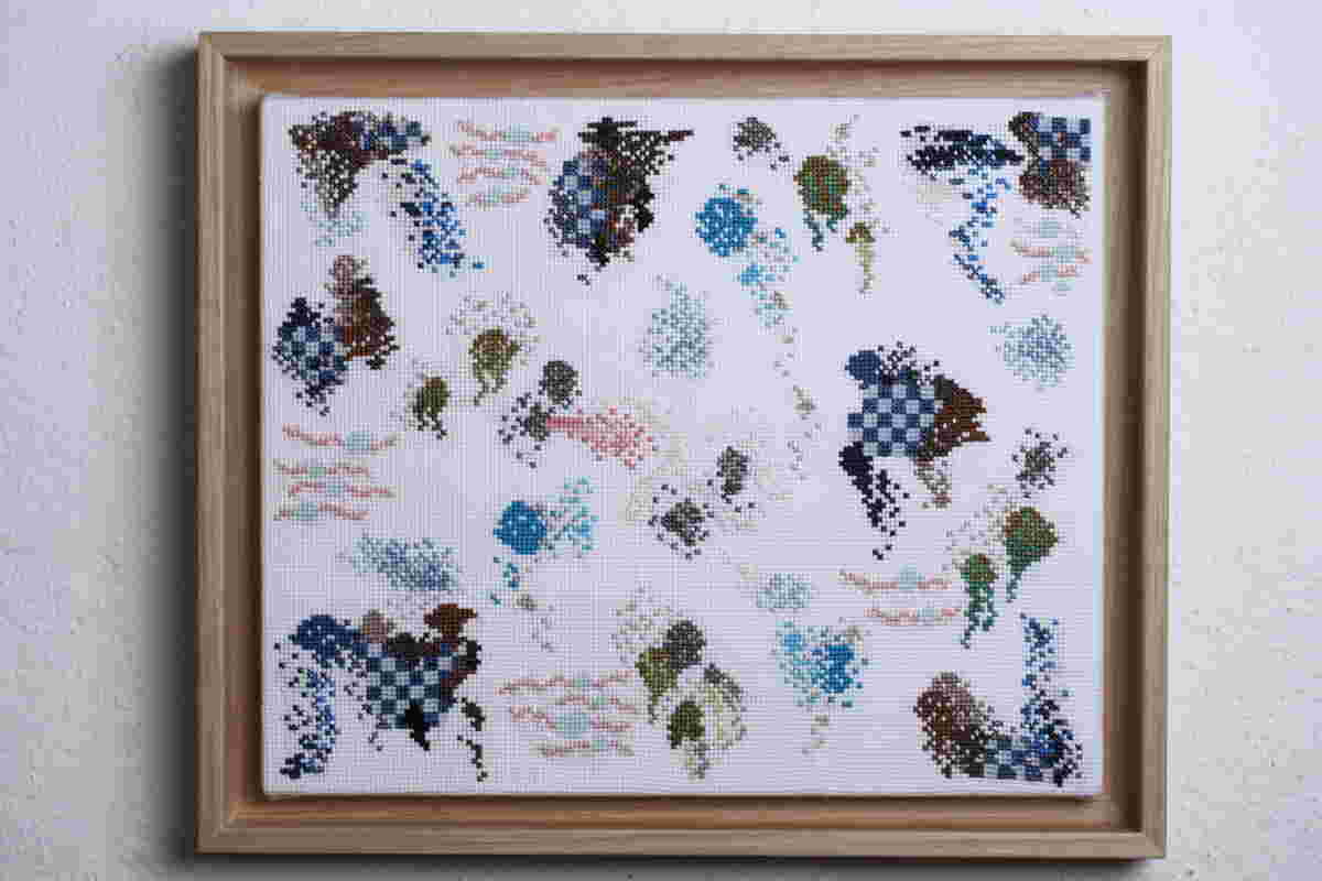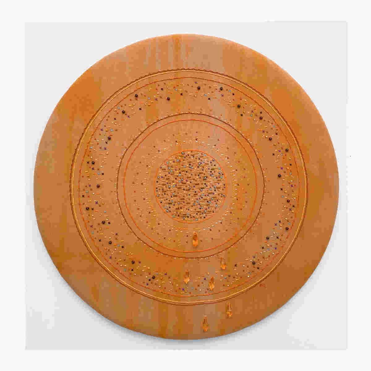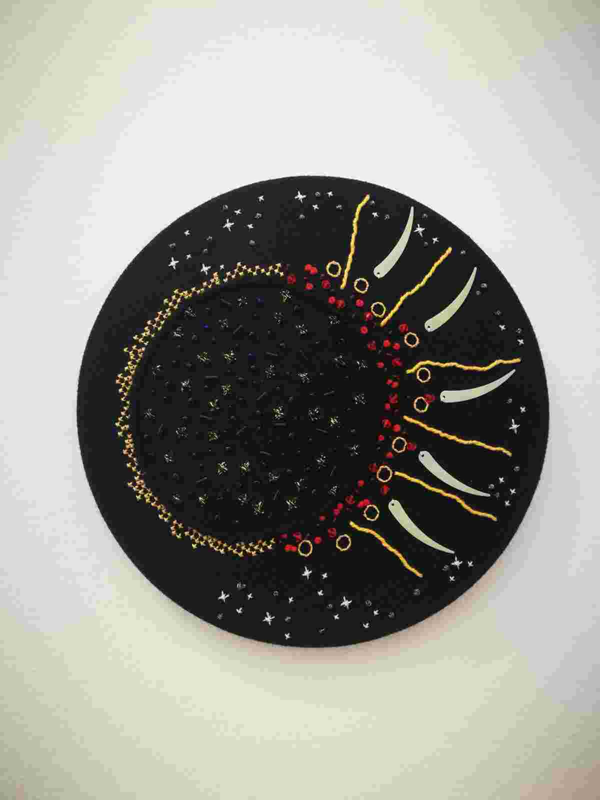handmade embroidery on tie-dyed canvas, floss, sequins, beads