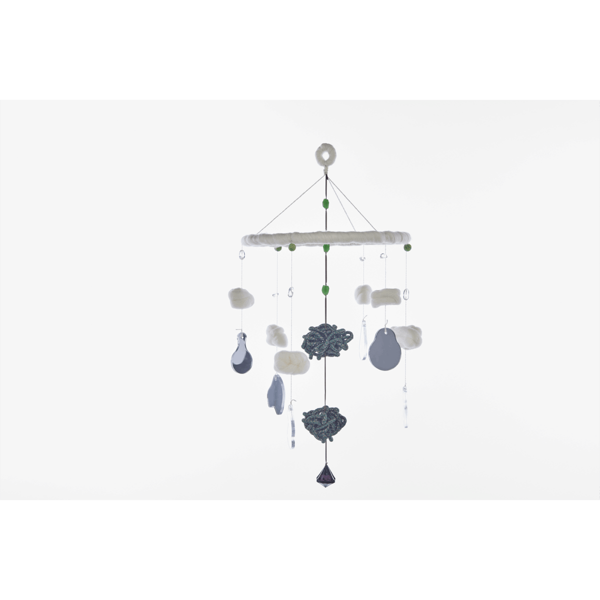 embroidery loop, undid wool roving, silk thread, ribbon, plexiglass mirror, beads