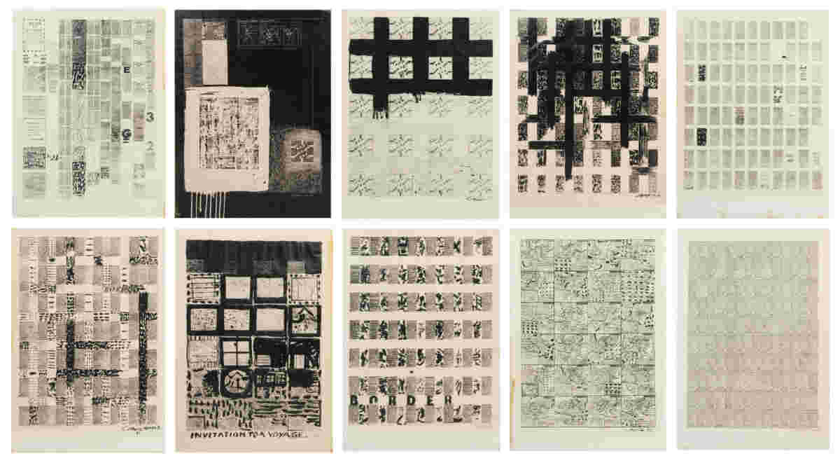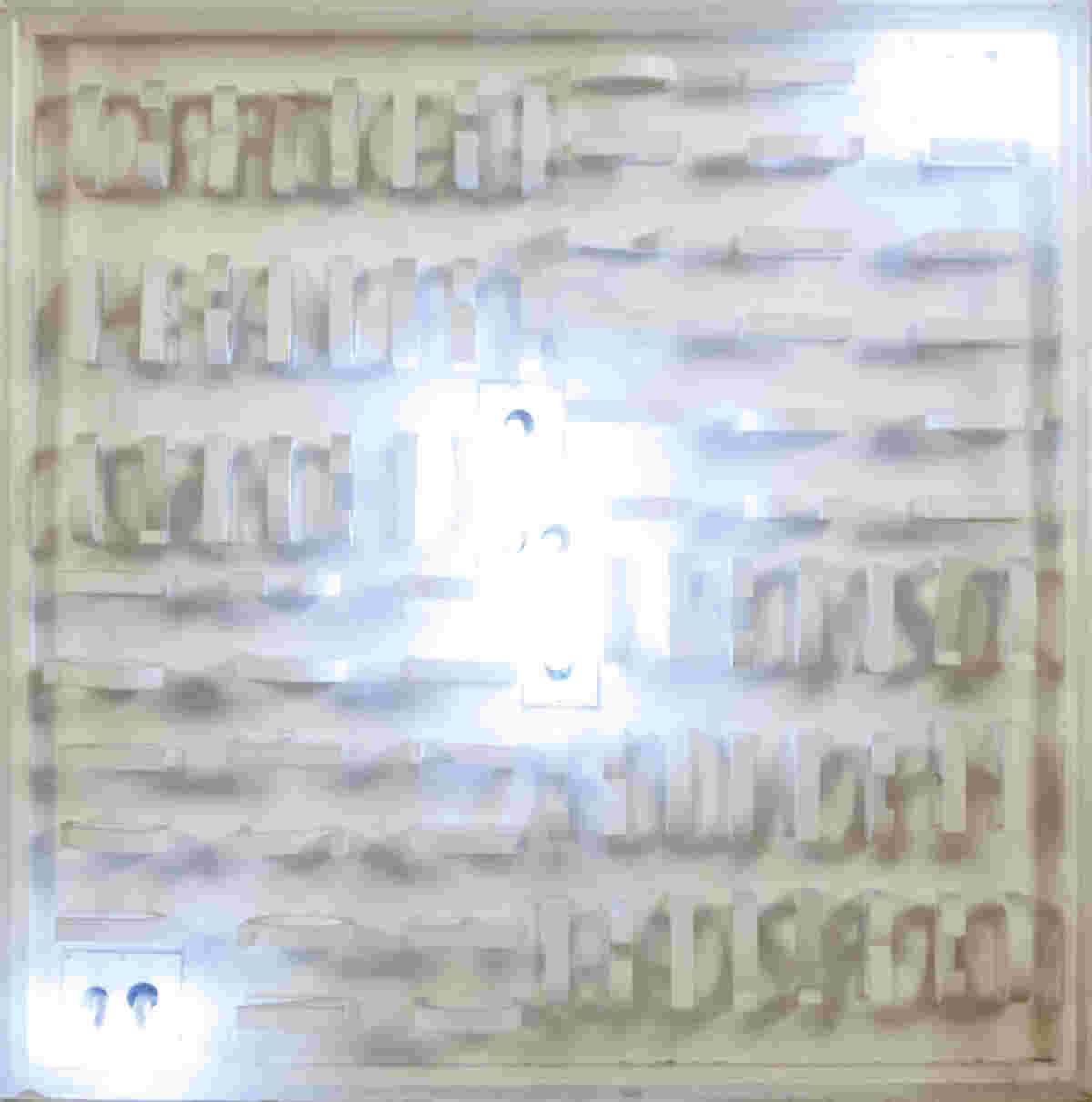 She interrogated other forms of communication in her Newspapers series. For the largest of these works on canvas, Chryssa created grids of letters by repeatedly stamping the surface with printing plates salvaged from newspapers including the New York Times, then based in Times Square. The quasi-mechanical method she used to reproduce stock indices, weather reports, advertisements, and classified ads predates the repetitive use of everyday images that would come to define Pop art. By obscuring the legibility of text and letters across media, Chryssa sought to ques- tion the limitations of language and draw attention to the poetic potential of form and light. In a lecture delivered at New York University in 1968, she stated: “I have many doubts about words that have been established and used in the vocabulary of art. I am desperate because, although they include so many possibilities of interpretation they finally establish a limited understanding.”[4]