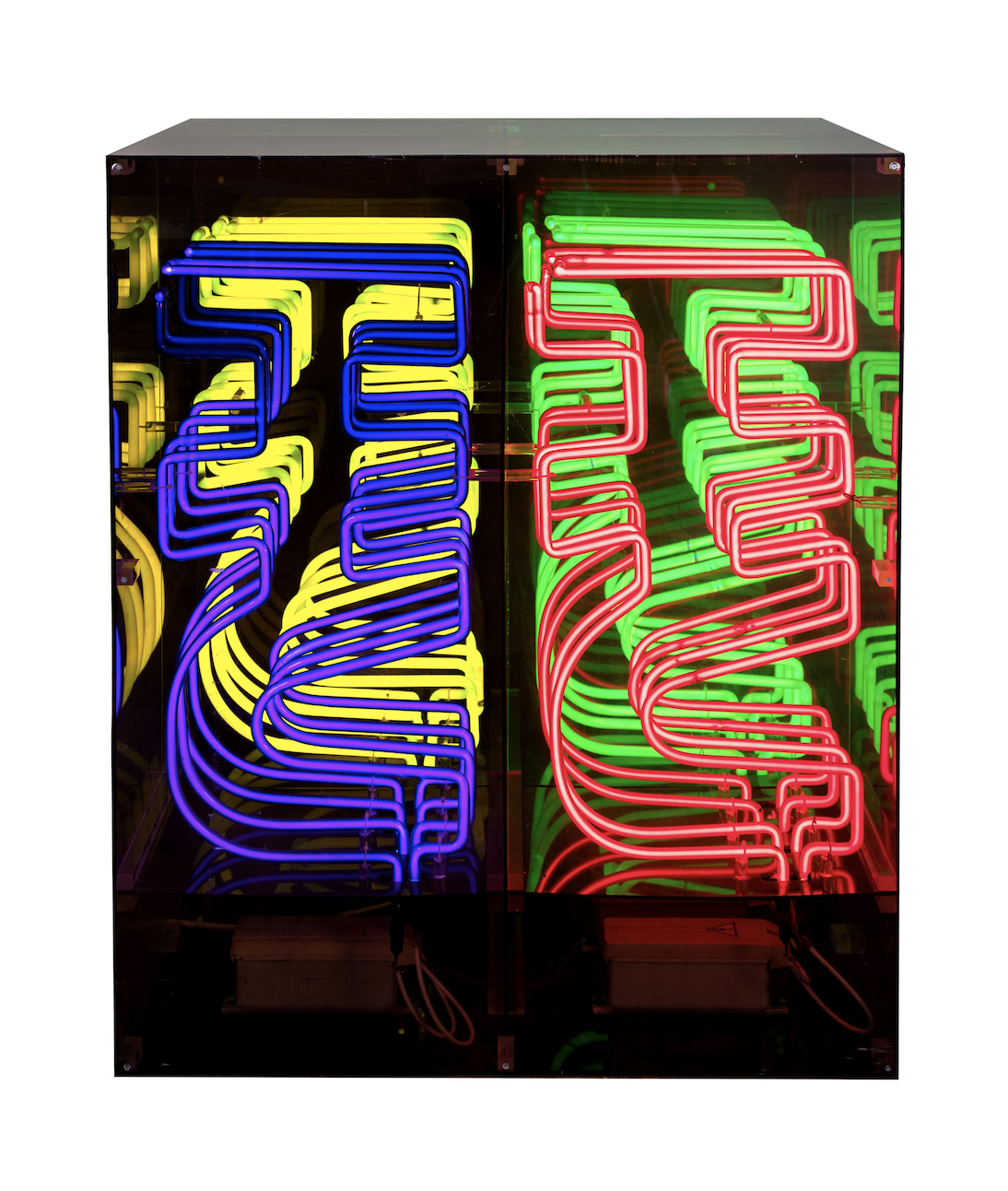 neon lights, plexiglass, neon sculpture with timer in plexiglass box, red, yellow, green and blue