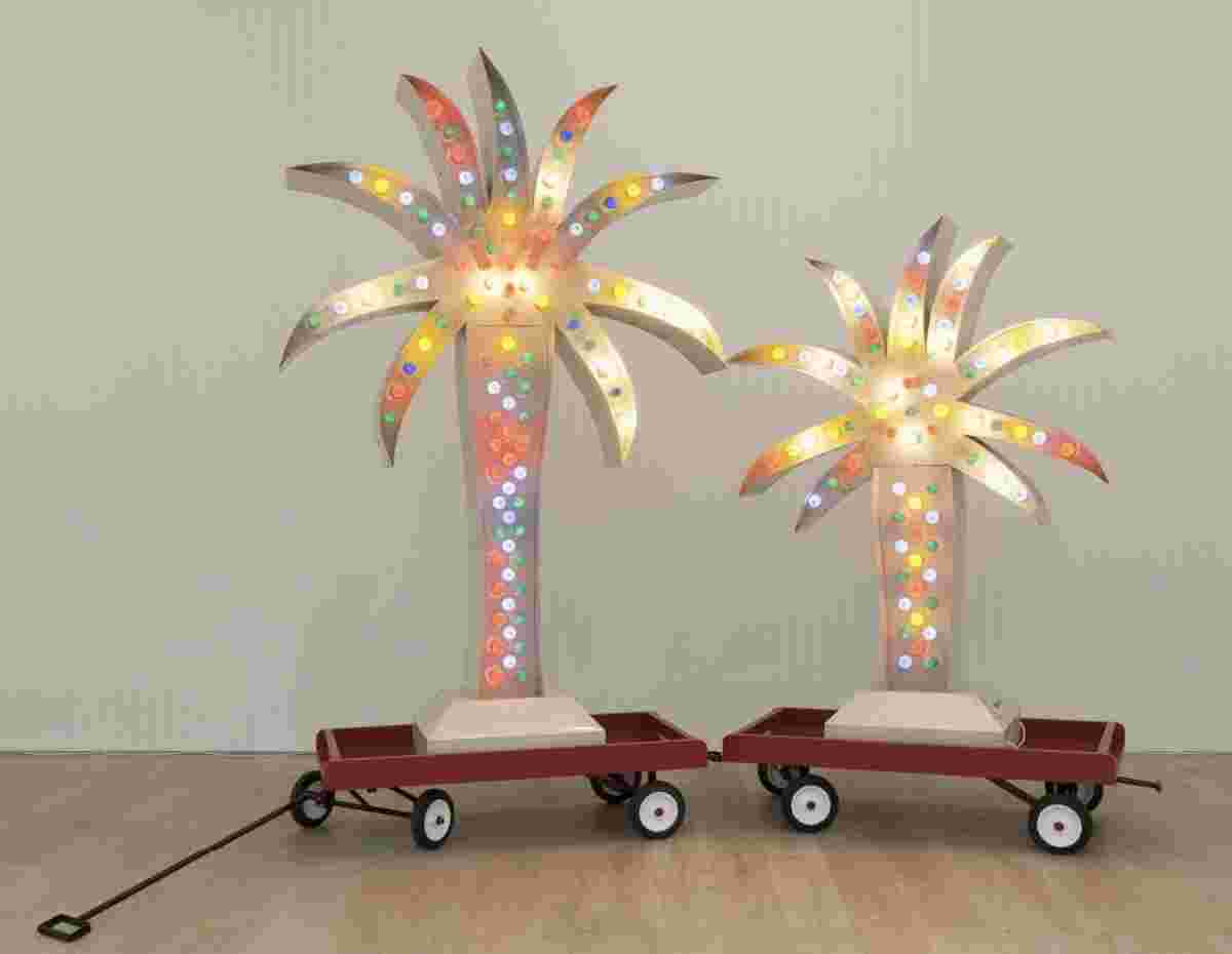 With Twin Palm Island (2012), one of her iconic pieces, she summarises several of the ideas found throughout her work. Exoticism, tourism and decadence are reflected in this metal sculpture with coloured bulbs, recalling the signs over tourist establishments in decline. The two series of silk-screen posters A Modest Proposal (2010-2012) and Faux Guide (2015) complete the exhibition and extend this universe of palm trees and fossils.