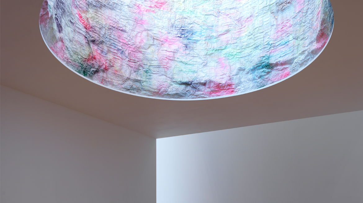 Visitors walk beneath a seemingly banal structure with a blocky exterior, containing a beautifully textured and pigmented interior surface which reflects and refracts the light. This space of hope and spiritual reflection is presented by Marina Tabassum (b. 1969, Bangladesh) and Rana Begum (b. 1977, Bangladesh).