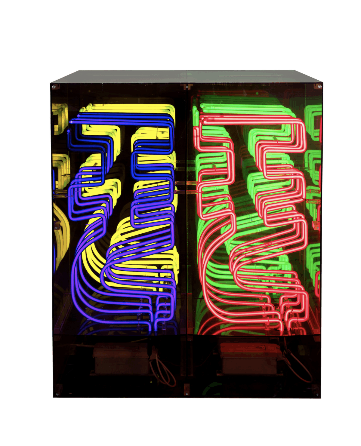 neon lights, plexiglass, neon sculpture with timer in plexiglass box, red, yellow, green and blue