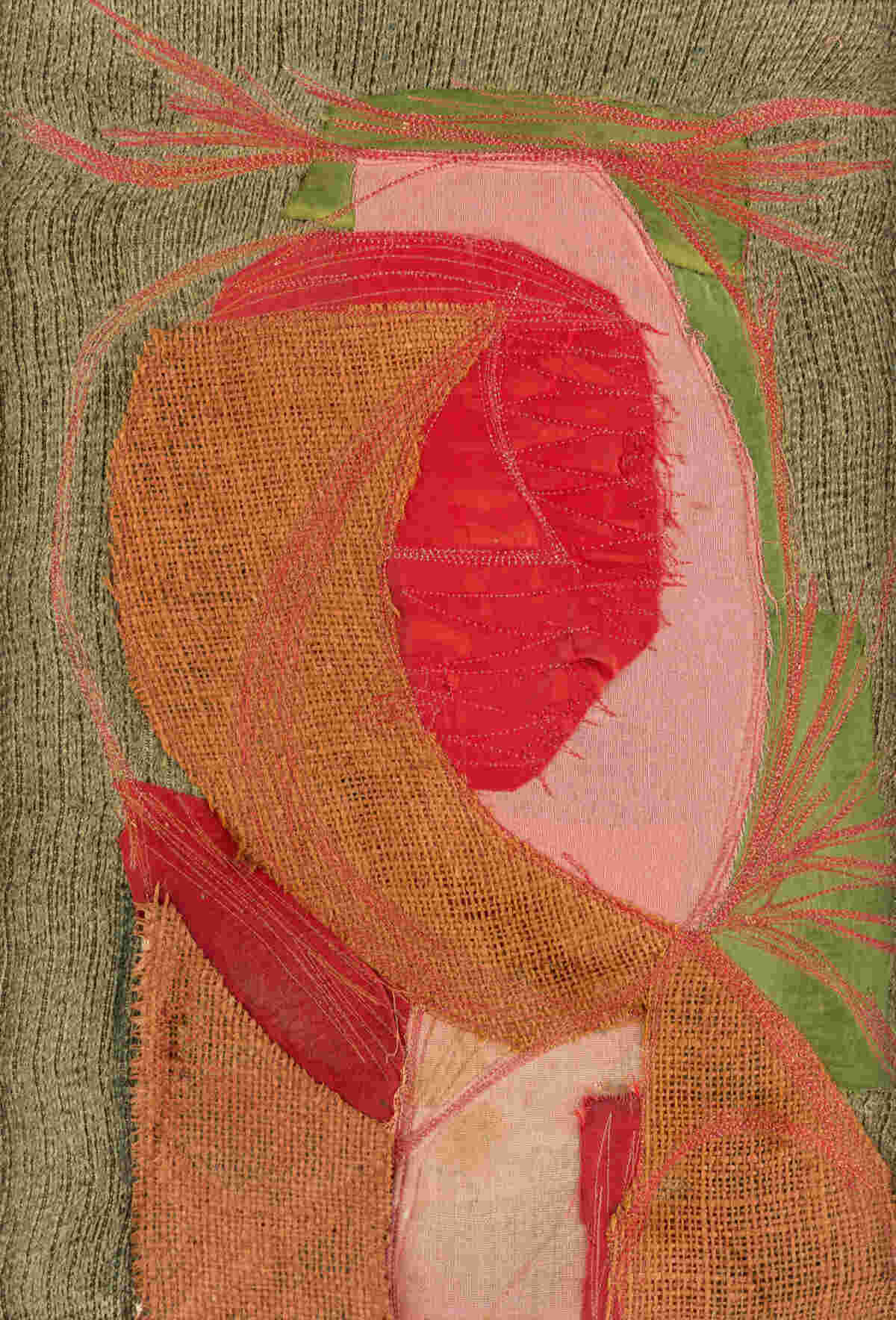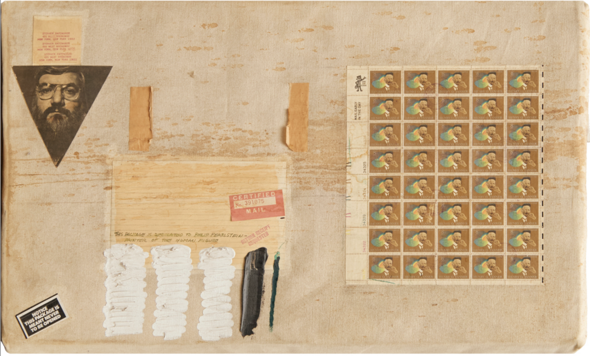 oil paint, paper collage, postcards, artist studio stamp, pen, in plexiglass box
