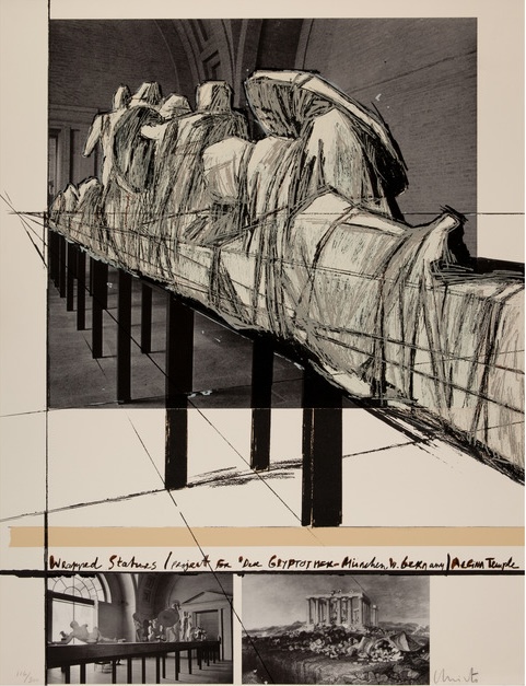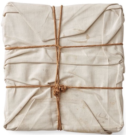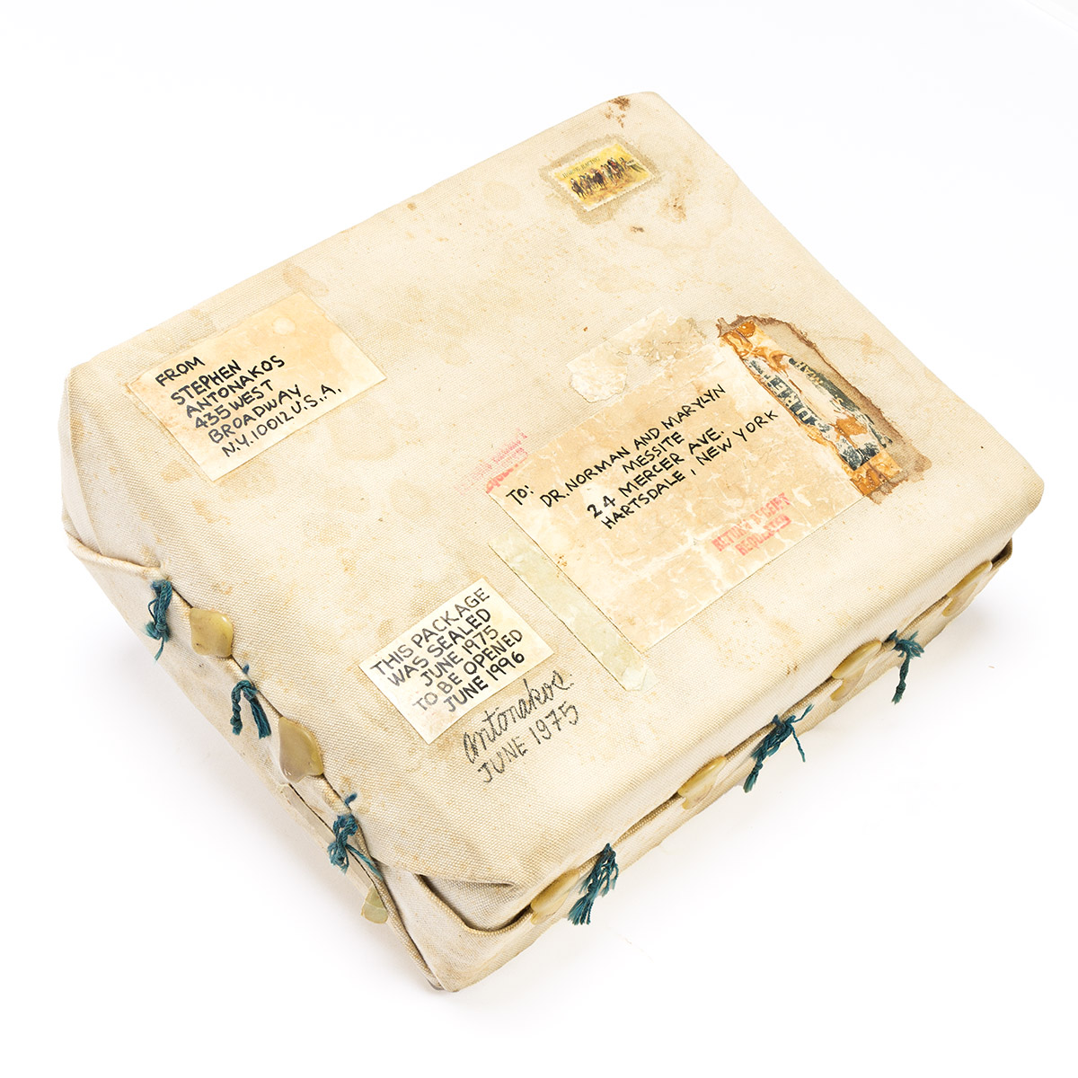 canvas wrapped box sealed with string and wax containing approximately 70 Ideas for Prints and Air Brush Paintings, crayon drawings on paper