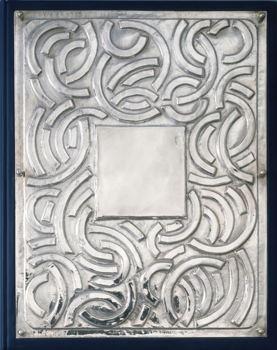 unique artist’s book, hand bound – 76 pages of various etching techniques, cuts and collages on Arches and Dieu Donne custom paper and mylar, cover is silver on blue leather